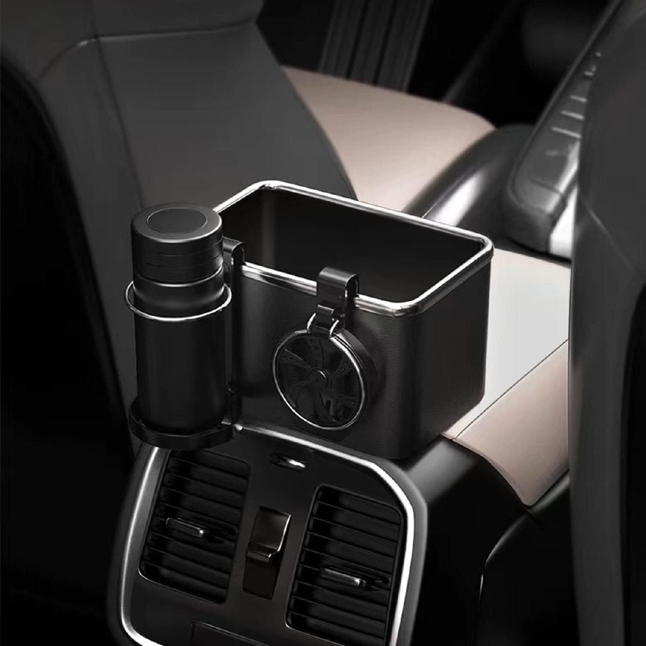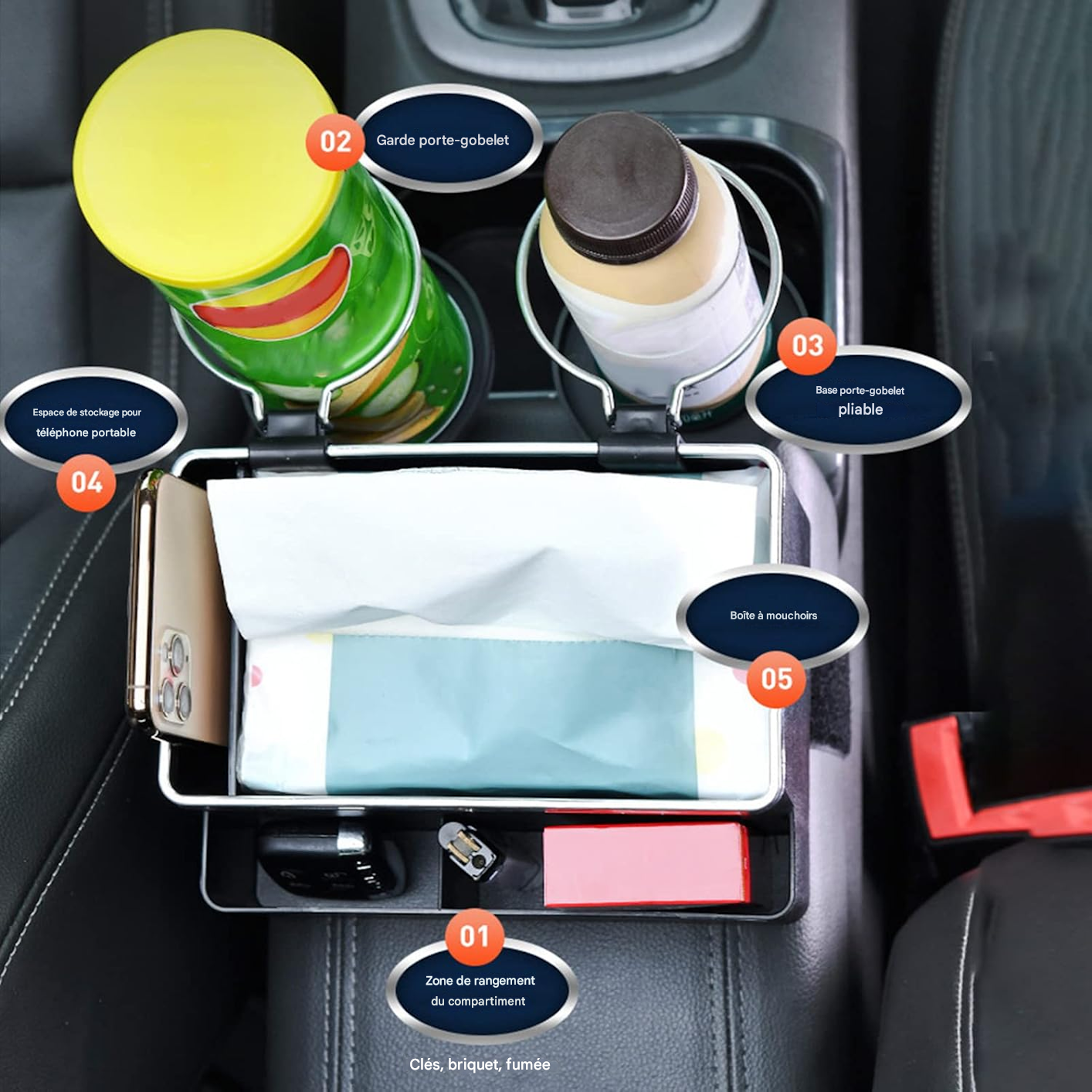 Le porte-gobelet pliable innovant sert également de support pour téléphone lorsqu'il est replié, permettant aux passagers arrière de profiter de divertissements pratiques. Une fois déplié, il maintient fermement les bouteilles d'eau ou les gobelets, offrant polyvalence et fonctionnalité