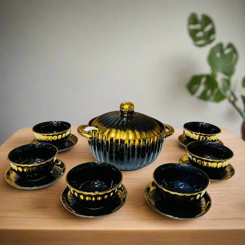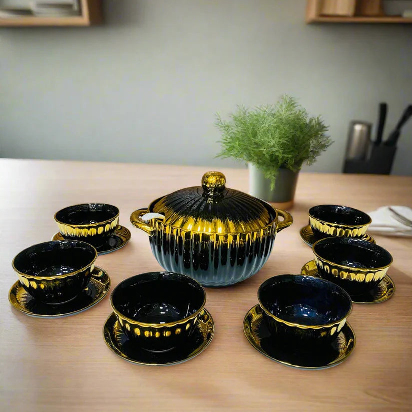 Ajoutez une touche d'élégance à votre table avec ce service de table raffiné en céramique noire et dorée 🖤✨. Idéal pour des repas sophistiqués, ce set est parfait pour impressionner vos invités lors des dîners, fêtes ou occasions spéciales 🎉🍲.