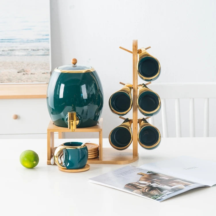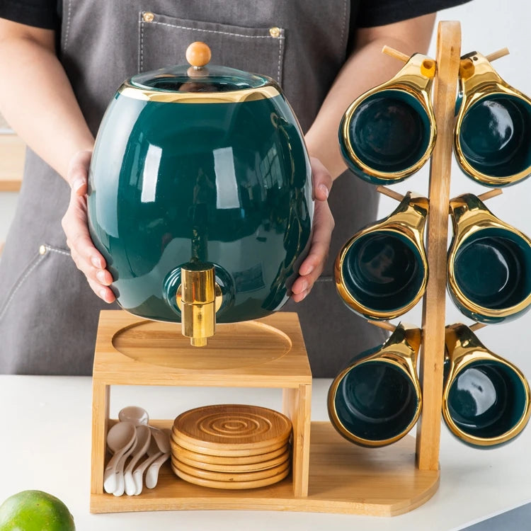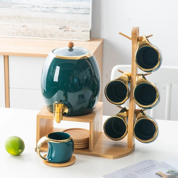 Carafe en céramique avec couvercle en verre et robinet en métal.
