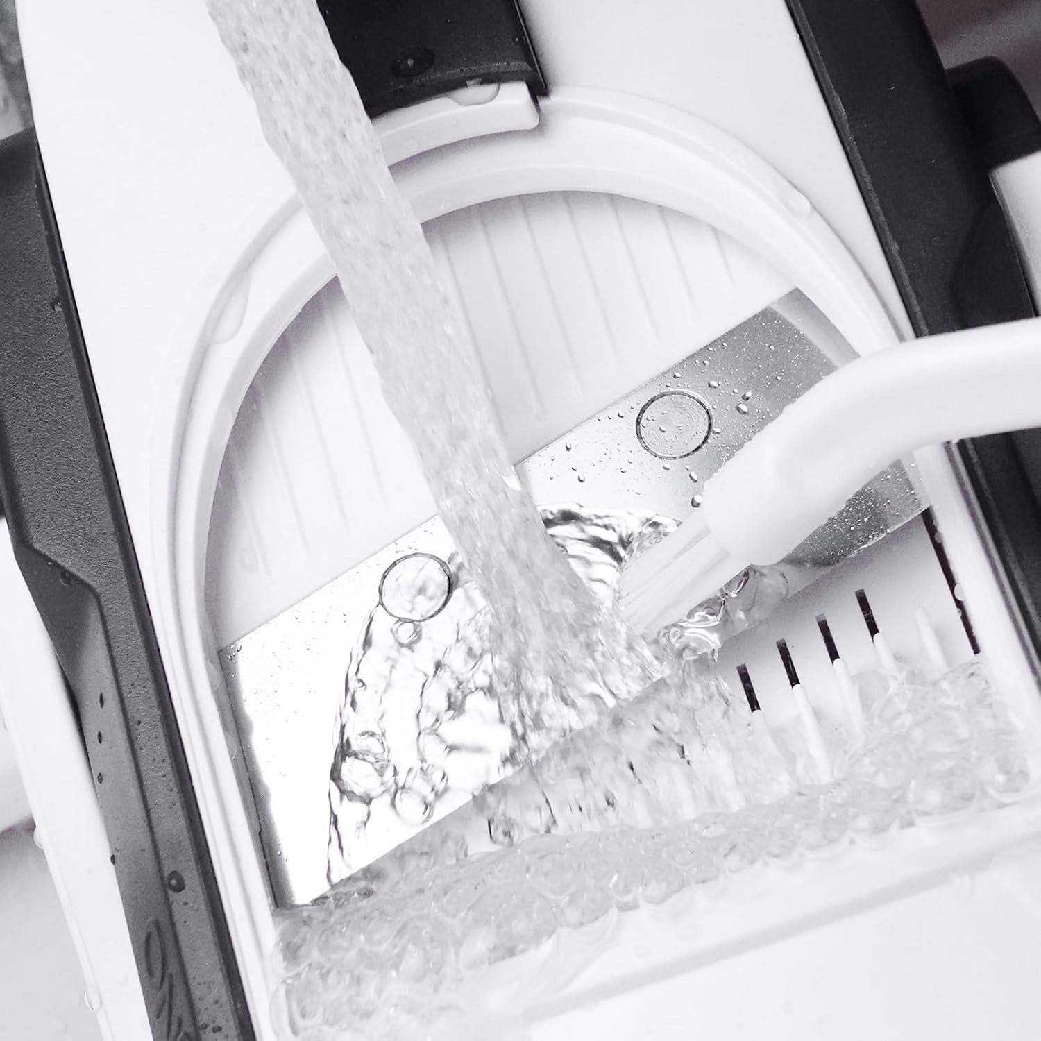 Le coupe-légumes avec pieds pliables est compact et sûr, ce qui facilite son rangement et son transport. La brosse incluse permet de nettoyer facilement les résidus de la lame. Les récipients transparents gardent votre cuisine propre et permettent de stocker facilement les aliments coupés. De plus, les lames sont hors de portée des enfants pour une sécurité maximale
