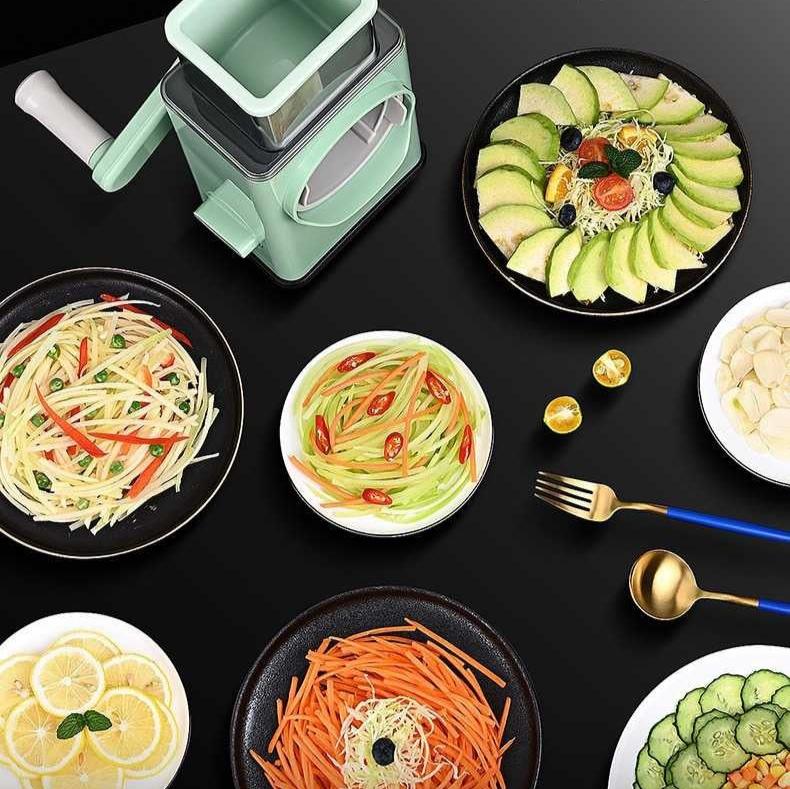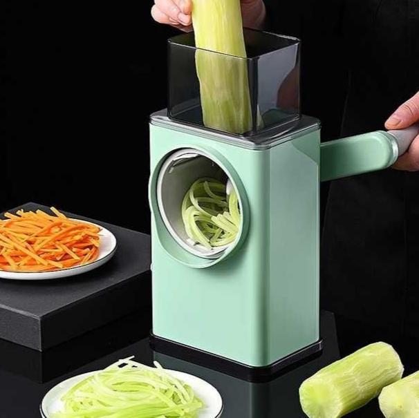 Ce coupe-légumes rotatif 4 en 1 est livré avec 3 lames interchangeables, un éplucheur et une brosse. Il peut être utilisé comme râpe à fromage, coupe-légumes, trancheur à salade, coupe-julienne pour pommes de terre et trancheur à fruits, offrant une polyvalence maximale pour toutes vos préparations culinaires
