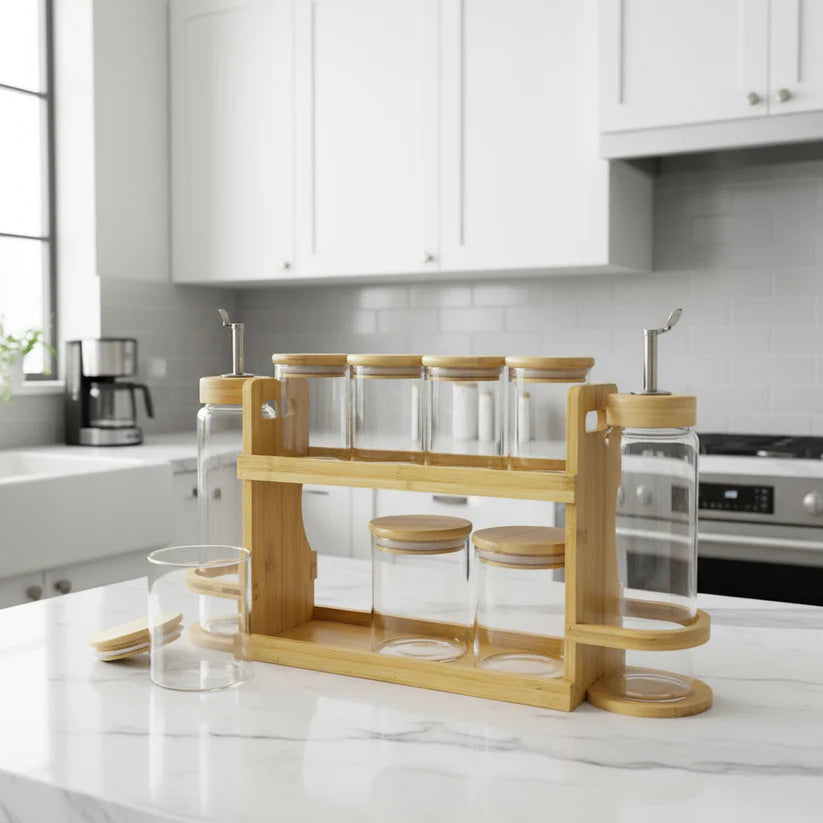 Apportez une touche raffinée à votre cuisine avec cet ensemble complet de pots de rangement en verre transparent et couvercles en bambou, disposés sur un support en bois naturel.