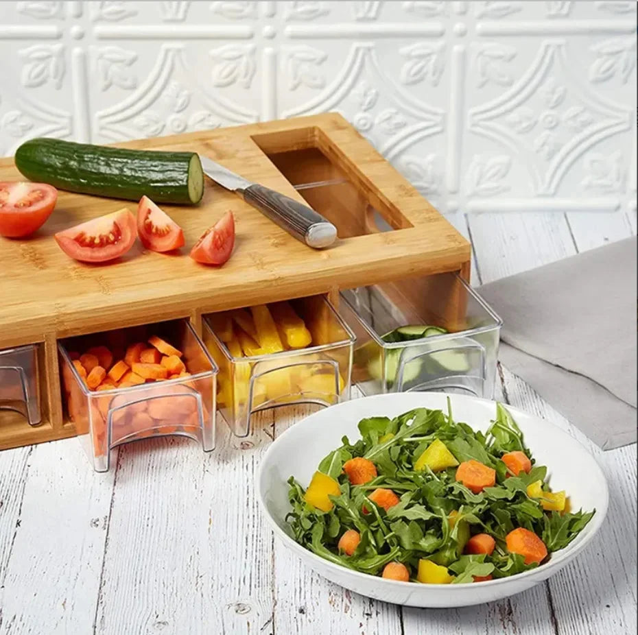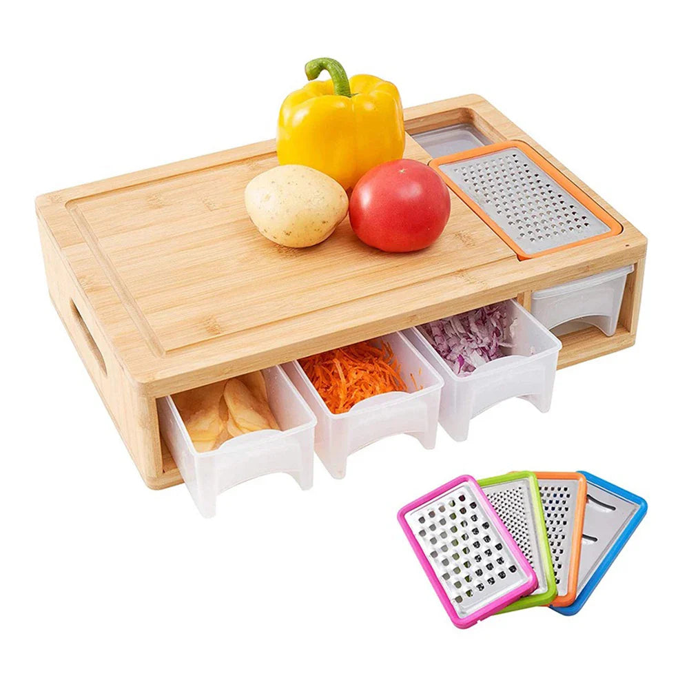 Cette planche à découper rectangulaire enbambou écologiquevous permet depréparer vos aliments rapidement. Les contenants intégrés facilitent le tri et le stockage, tandis que les râpes interchangeables rendent la préparation encore plus pratique.
