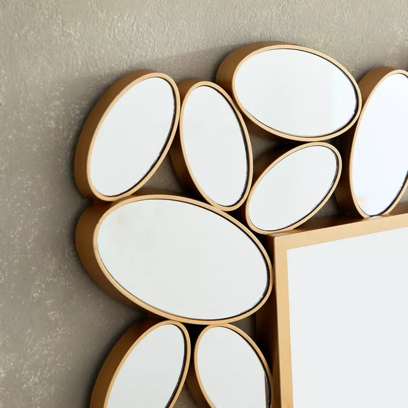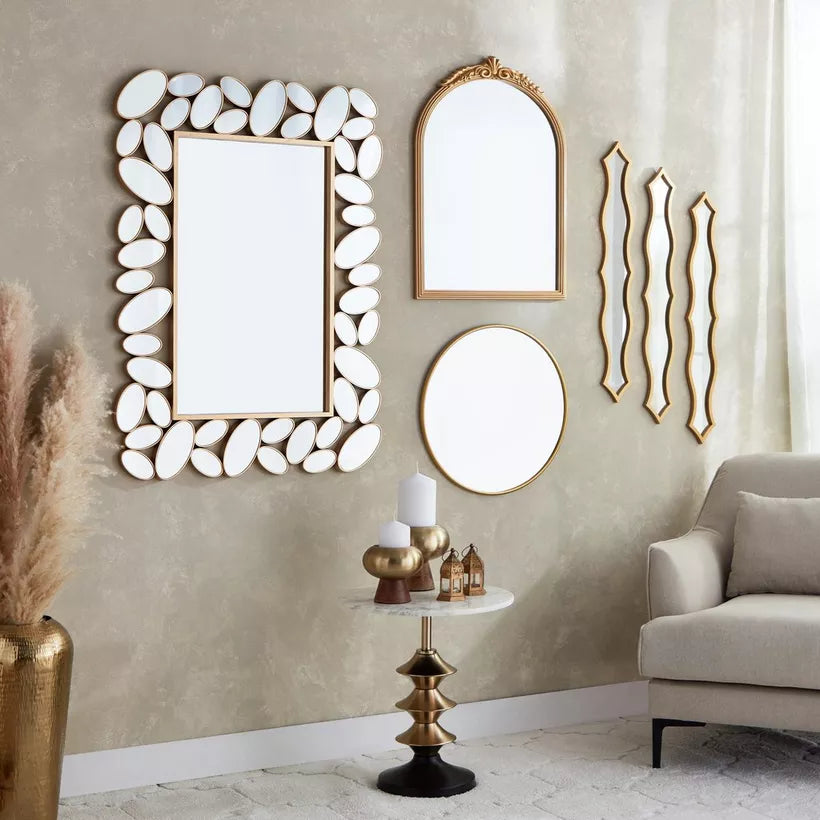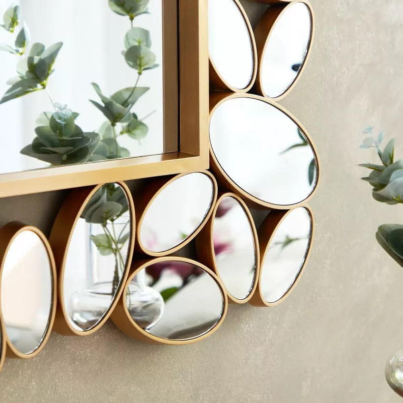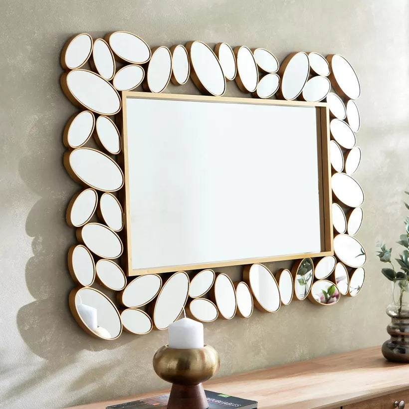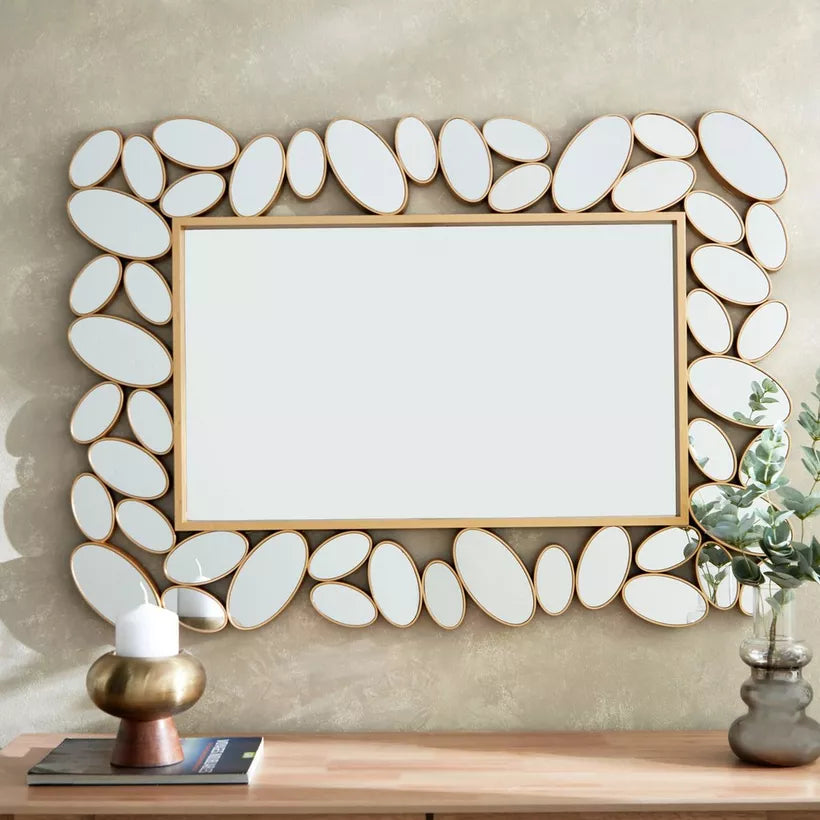Ce miroir décoratif se distingue par son cadre composé d’éléments ovales dorés, rappelant des galets soigneusement assemblés. Le contraste entre la finition dorée et le miroir central offre un effet luxueux et captivant, parfait pour sublimer un salon, une entrée ou une chambre.
