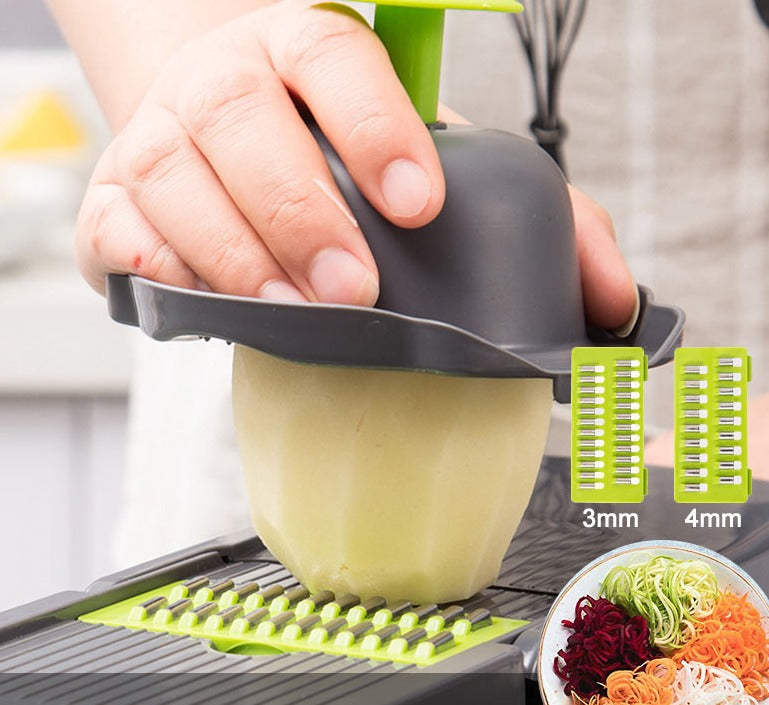 Avec 7 types de lames différentes et interchangeables, vous pouvez tout faire avec notre nouveau coupe-légumes : râper, hacher, couper en morceaux épais ou fins, peler des fruits et bien plus encore.