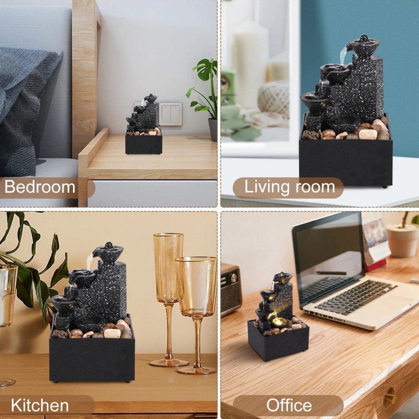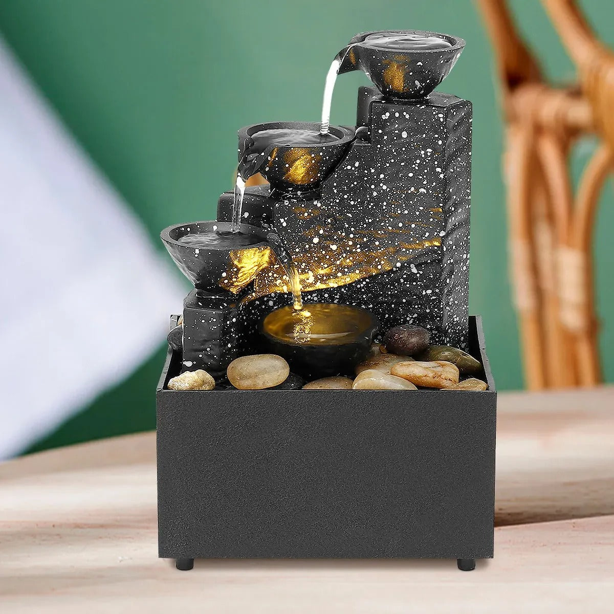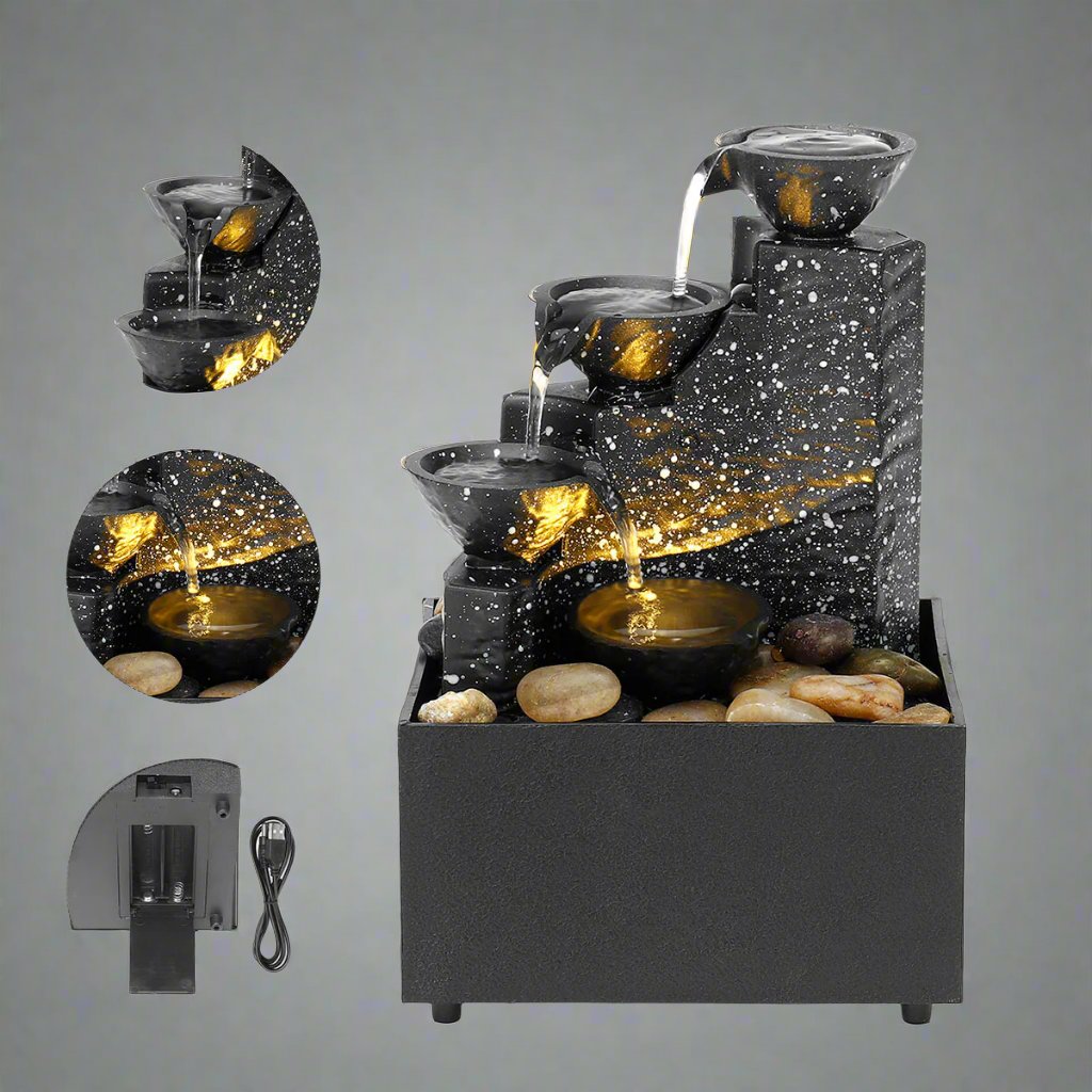 La fontaine offre un écoulement naturel de l'eau avec des hauteurs différentes, créant un son apaisant qui favorise le calme et la relaxation