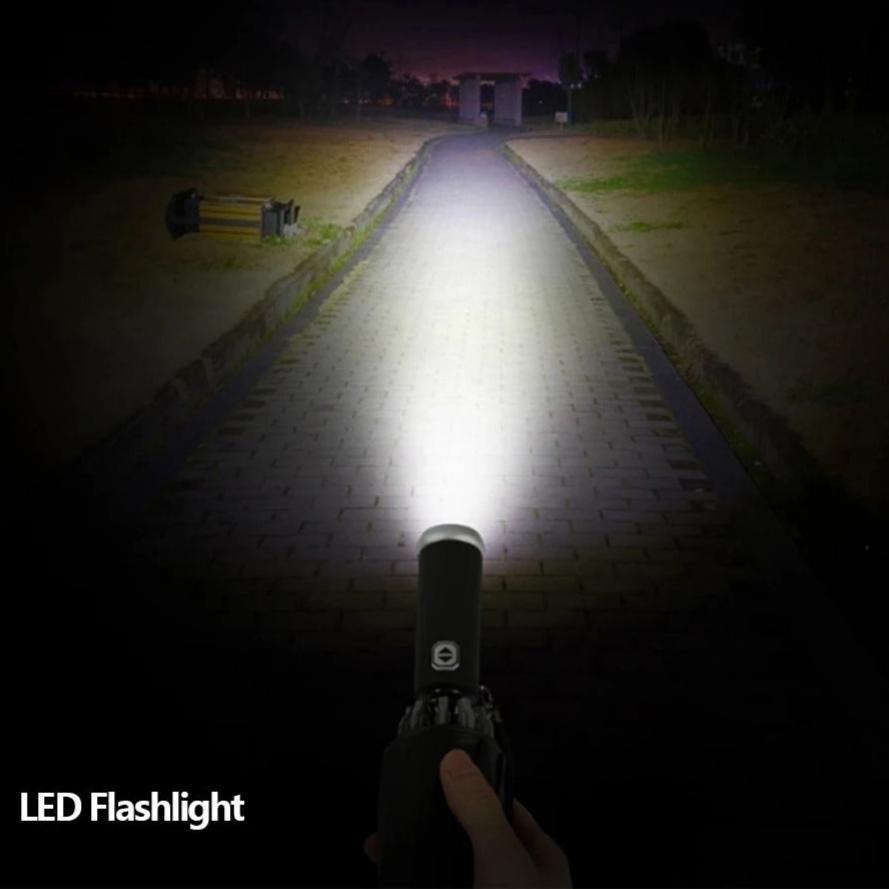 Conçu pour la sécurité, ce parapluie unique vous rend visible pour les automobilistes grâce à son bord réfléchissant et vous éclaire avec sa lampe de poche LED intégrée pour les nuits sombres et pluvieuses.