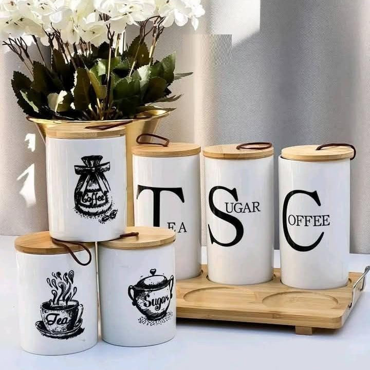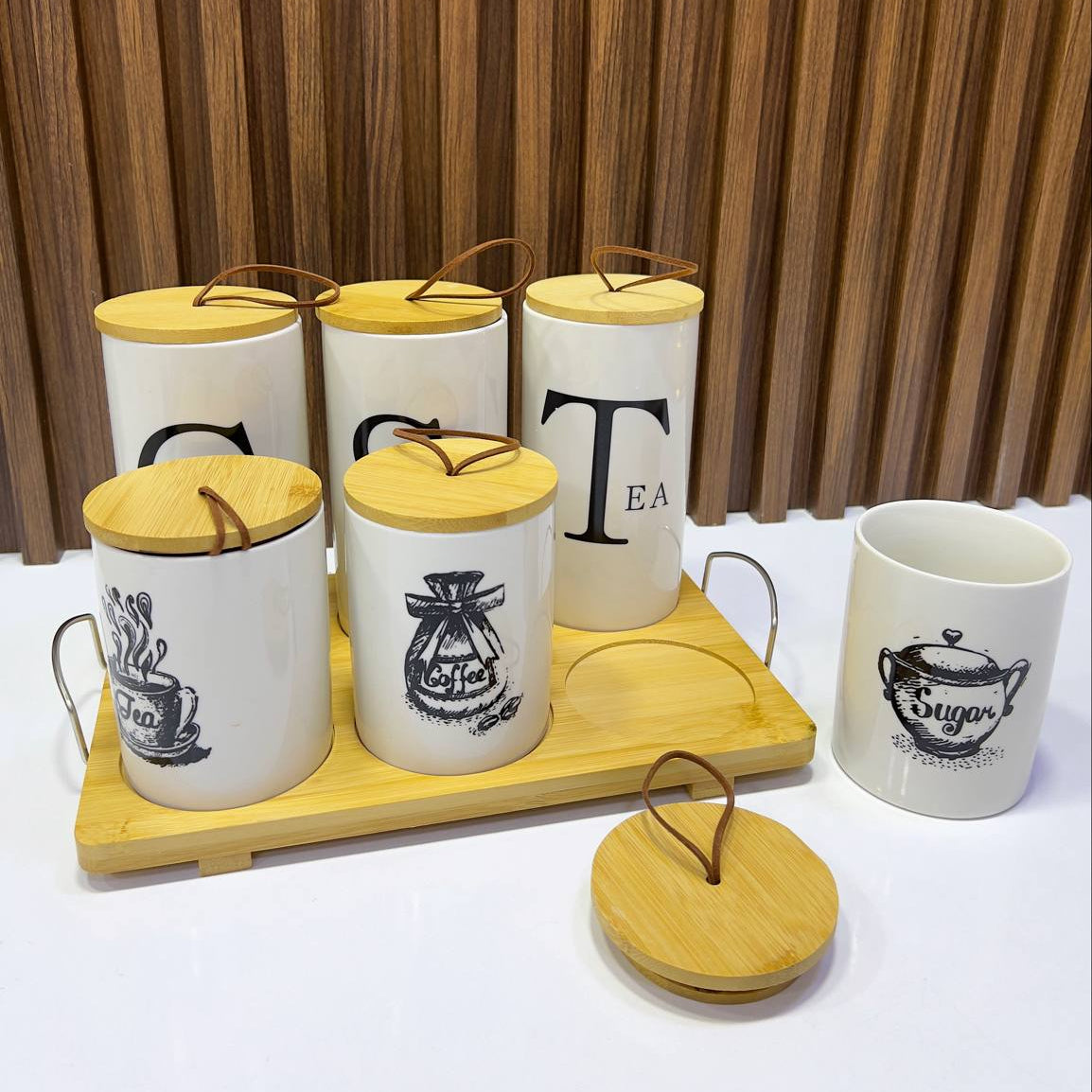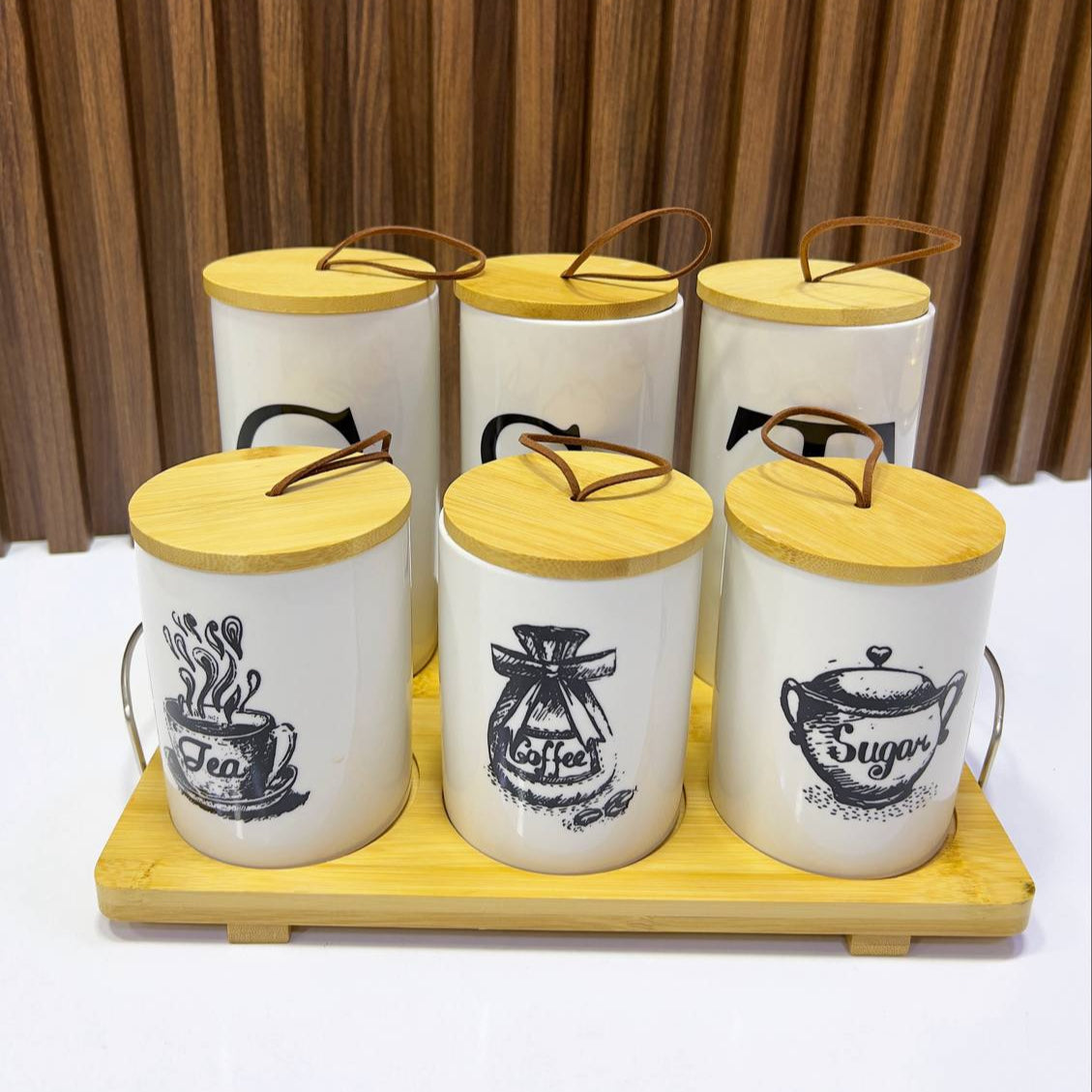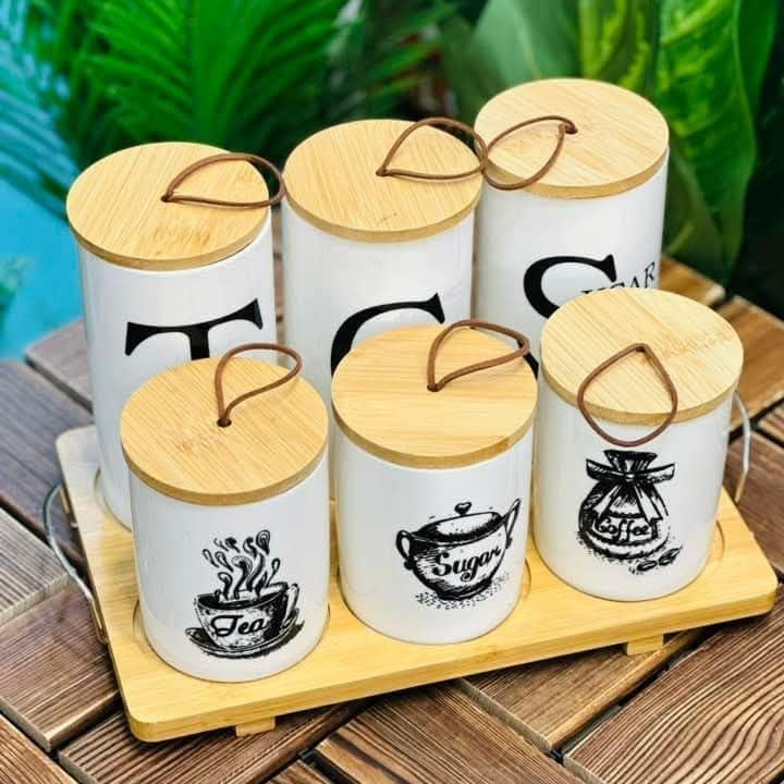 Idéal pour les foyers marocains 🇲🇦 Fini le désordre ! Ce set de 6 bocaux en céramique avec couvercles en bambou et plateau en bois va transformer votre cuisine. Parfait pour conserver votre thé, café, sucre, épices... tout en ajoutant une touche chic et moderne.