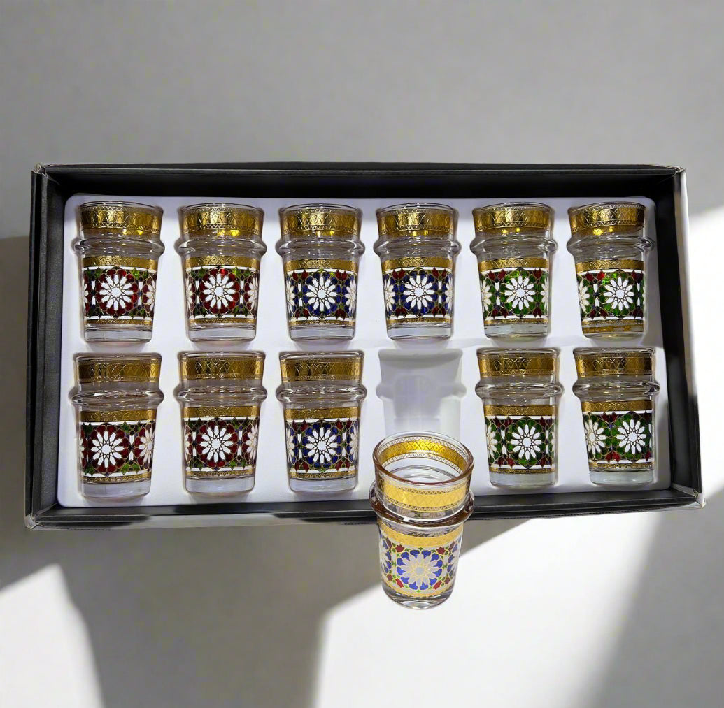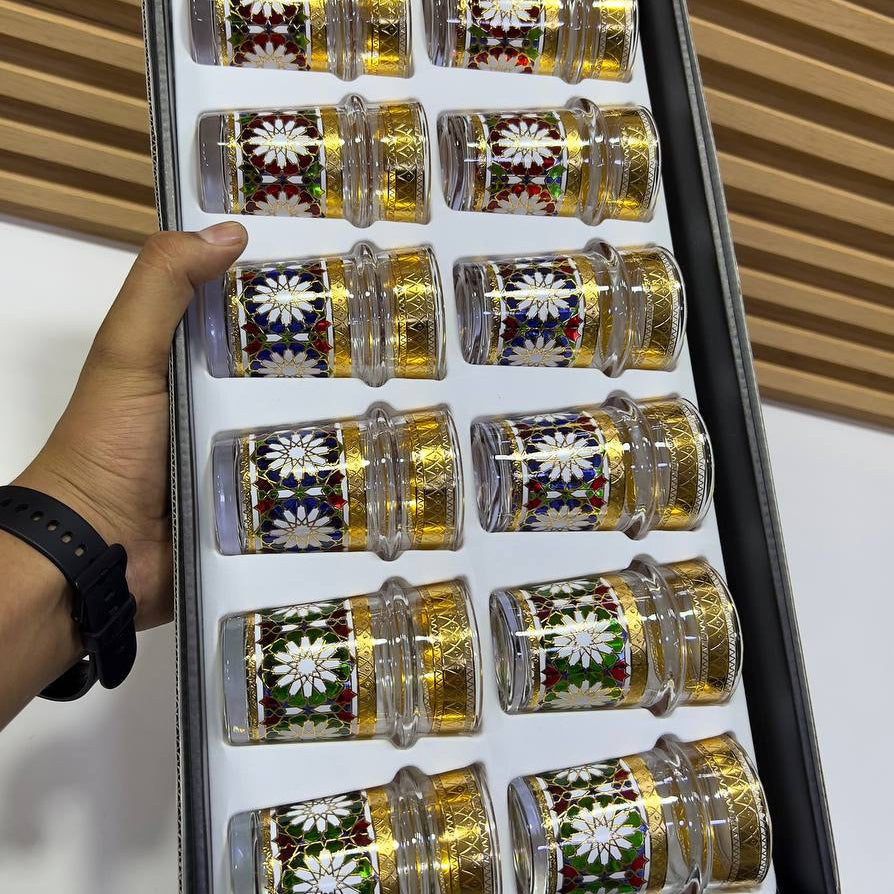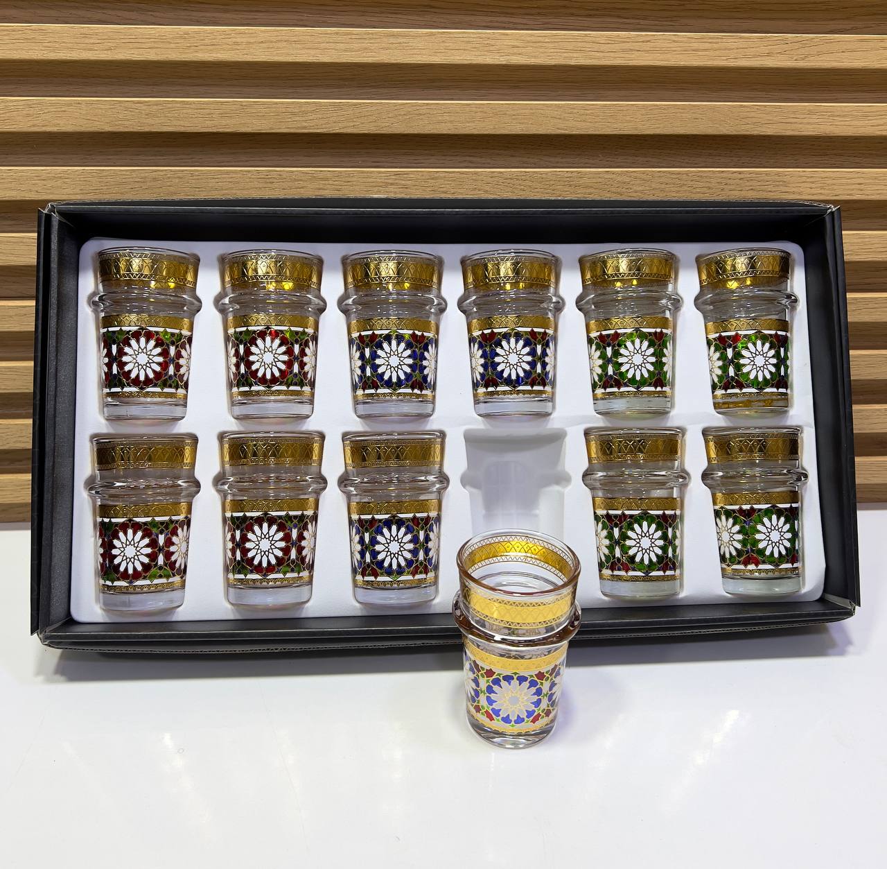 - 🏺 **Verre soufflé à la main** – Fabrication artisanale de qualité. - 🎨 **Motifs arabesques** – Détails géométriques & couleurs vives (rouge, bleu, vert, blanc). - ⭐ **Bords dorés** – Finitions élégantes en or, idéales pour les grandes occasions. - ☕ **Idéal pour le thé à la menthe** – Taille parfaite et design traditionnel. - 🎁 **Cadeau unique** – Parfait pour fêtes, mariages ou hôte distingué.
