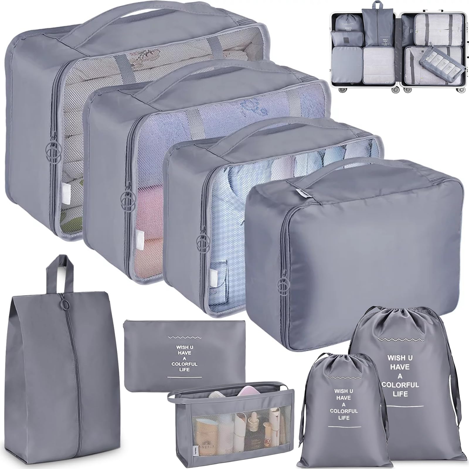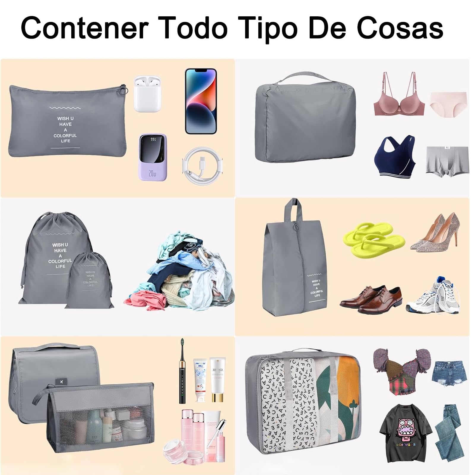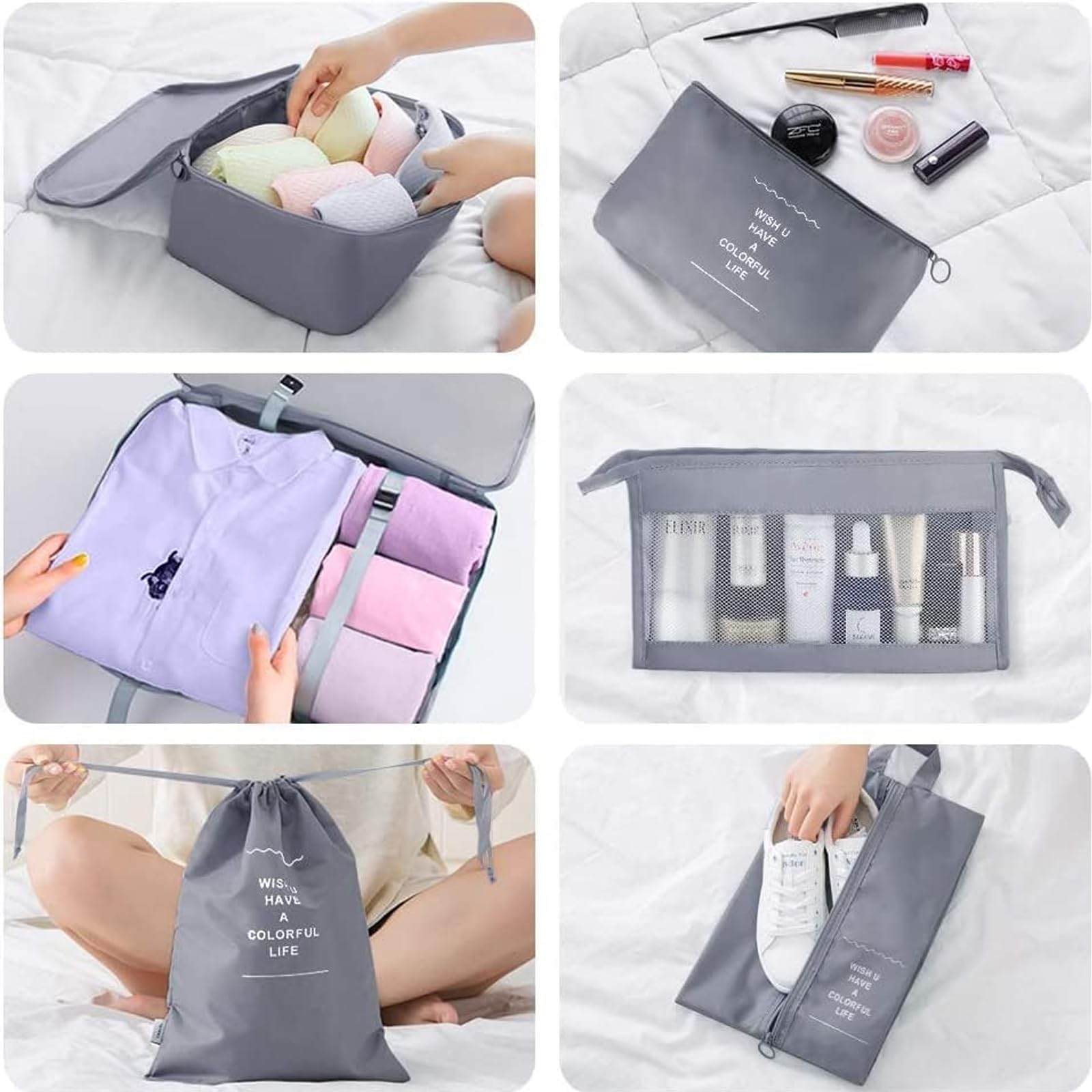 Ce set comprend 7 pièces essentielles pour organiser vos affaires, y compris des cubes de rangement pour vêtements, un sac à linge, un sac pour chaussures, un sac pour sous-vêtements, et un sac à dos pratique pour transporter vos effets personnels.