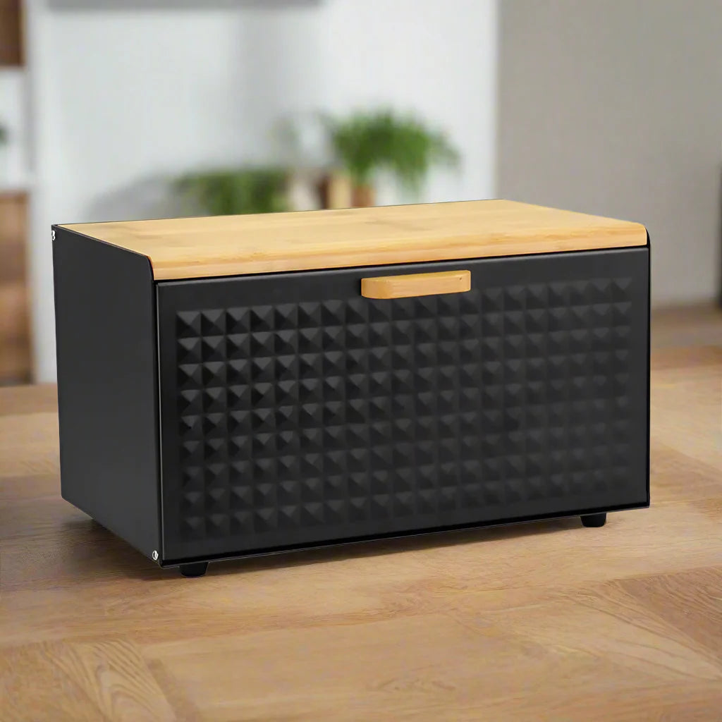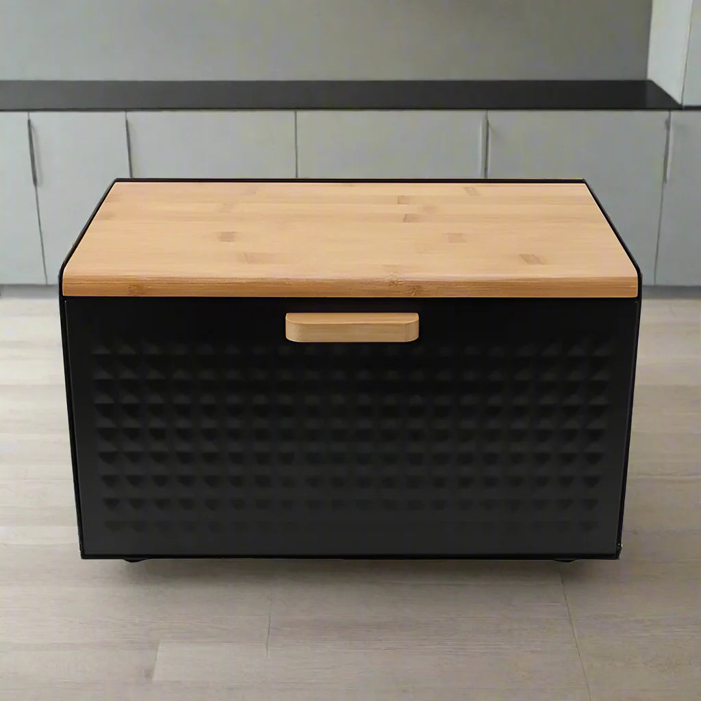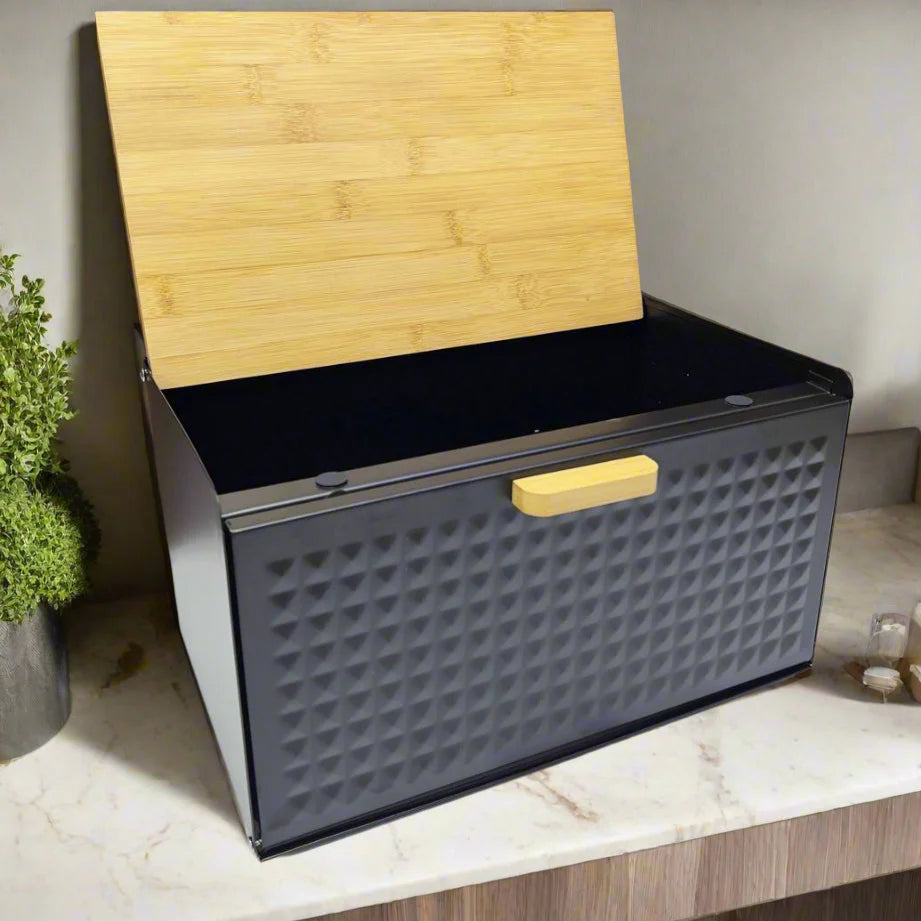 Cette boîte à pain élégante est conçue pour garder vos aliments fraisplus longtemps. Lemétal revêtuprotège de l’humidité tandis que lecouvercle en bamboupeut aussi servir de planche à découper 🥖🔪.