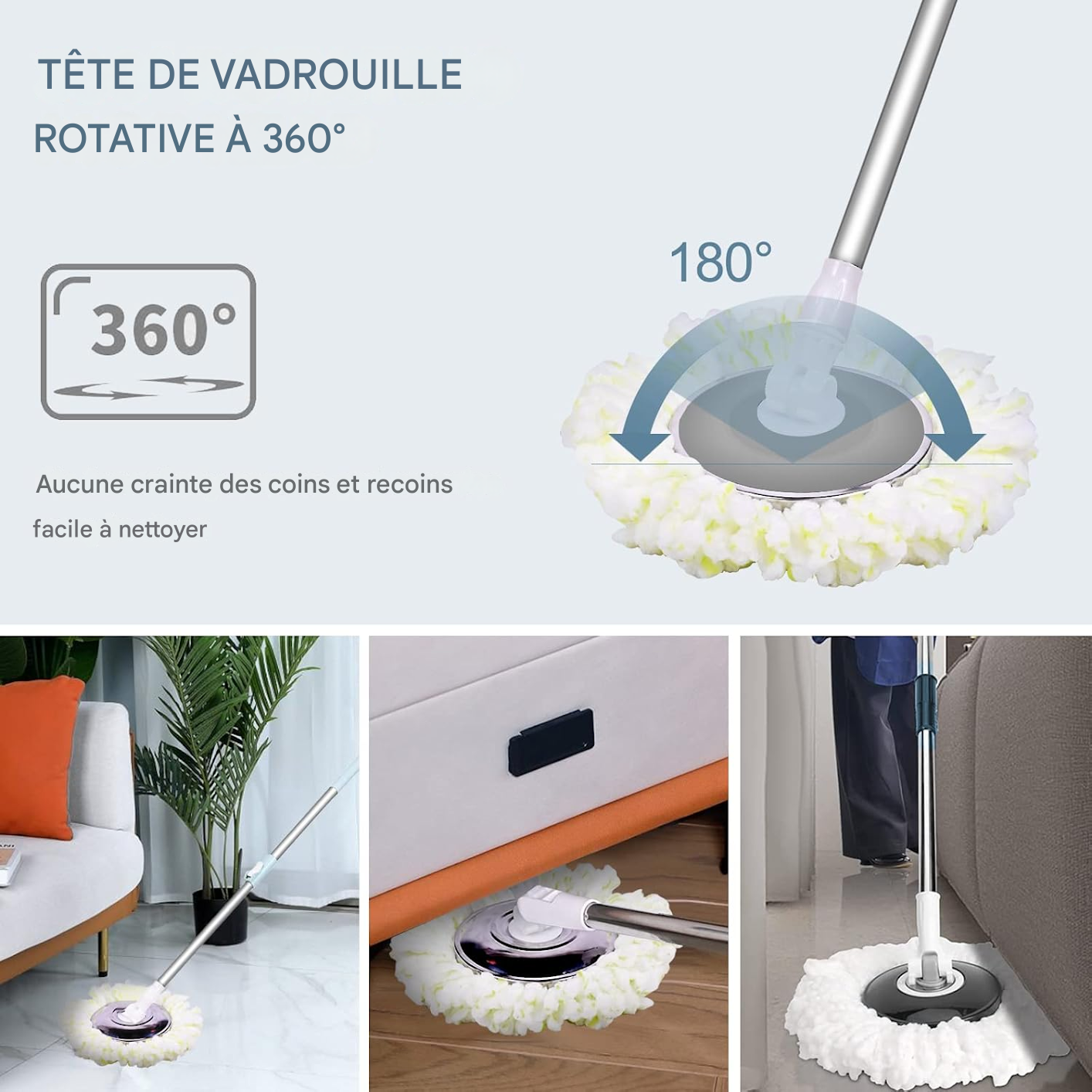 Grâce à sa tête rotative et sa tige réglable, la vadrouille atteint tous les coins difficiles (sous les canapés, lits, meubles). Fini les maux de dos