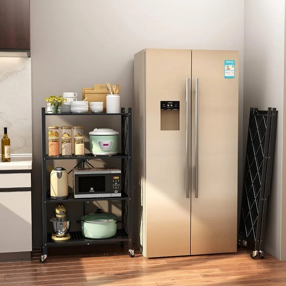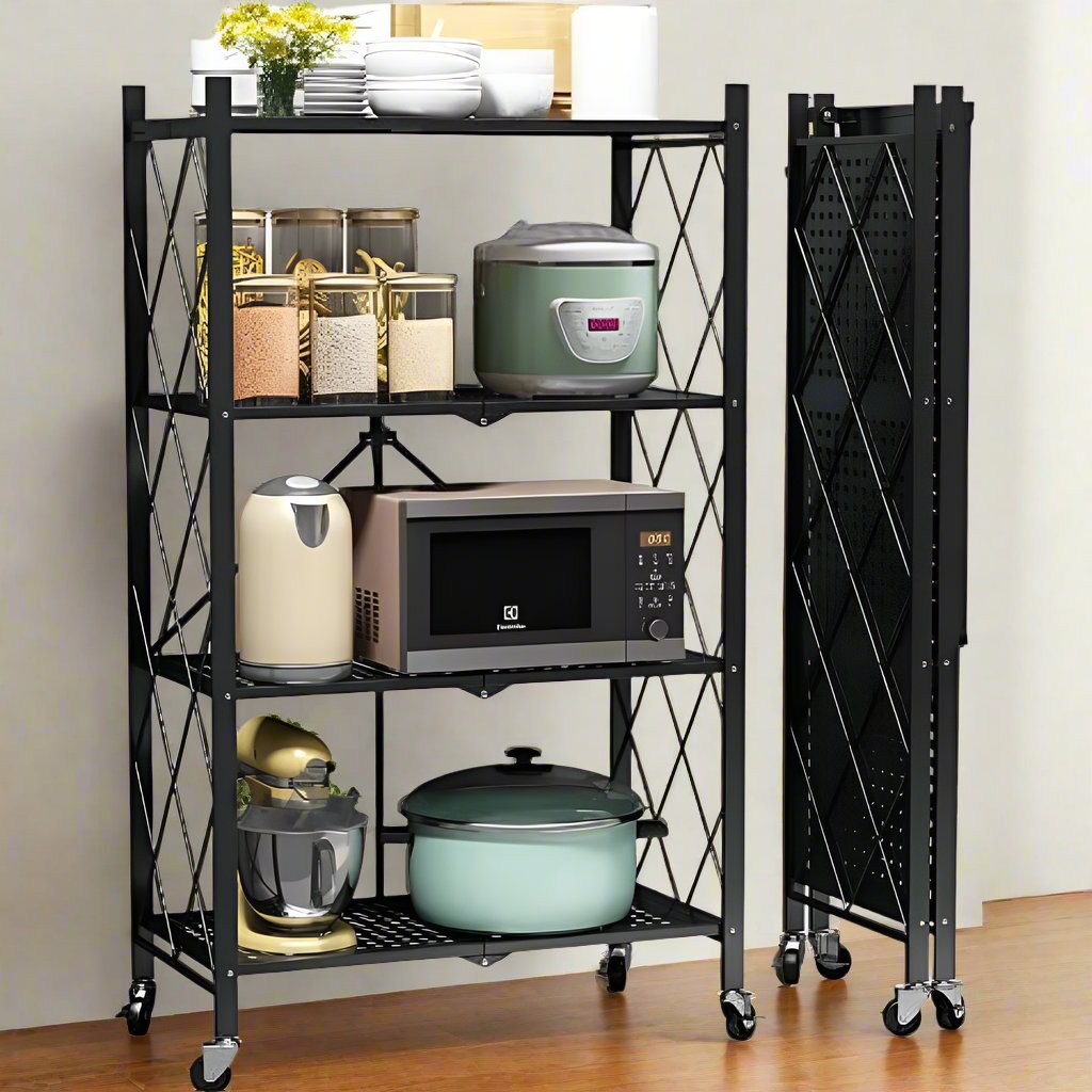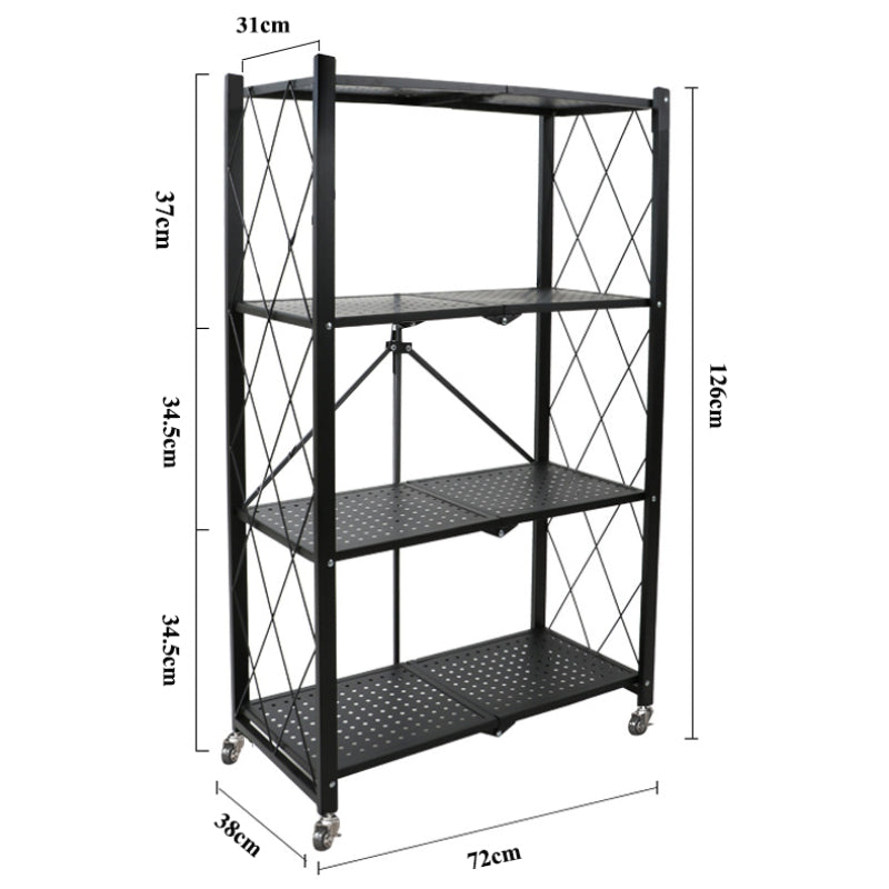 Unité de rangement à 4 étagères préassemblée à 100 %, se plie ou se déplie en quelques secondes sans outils.