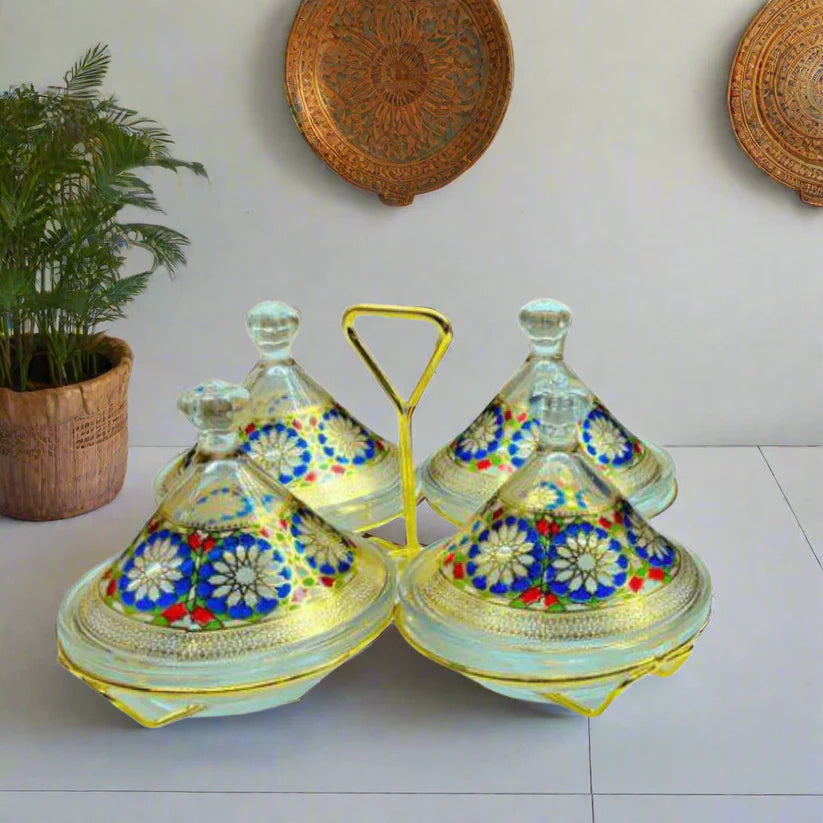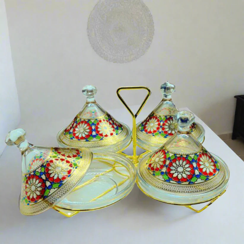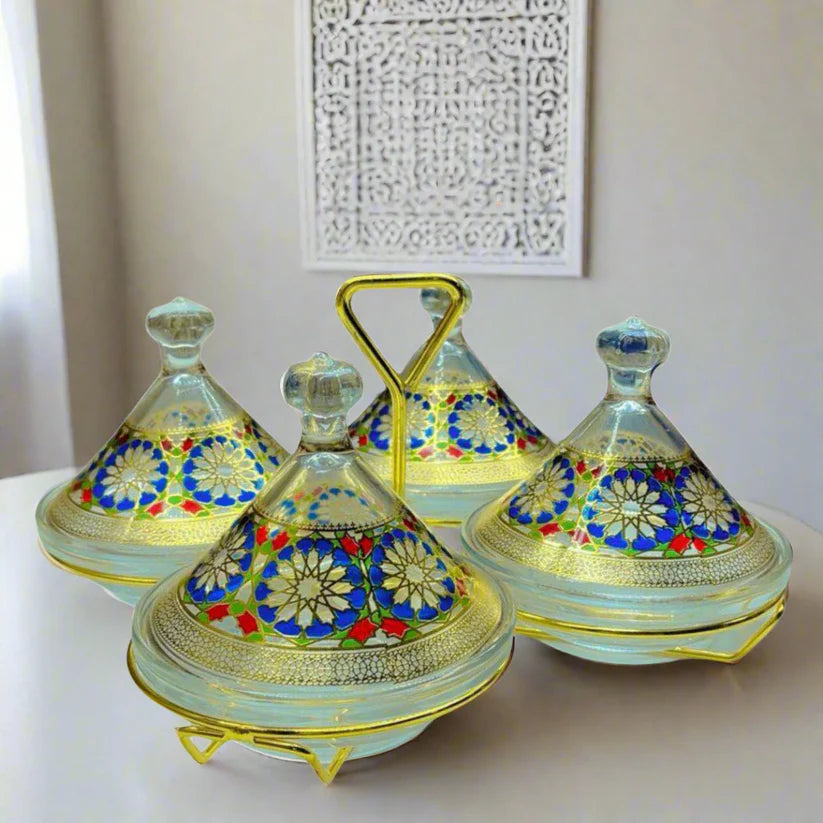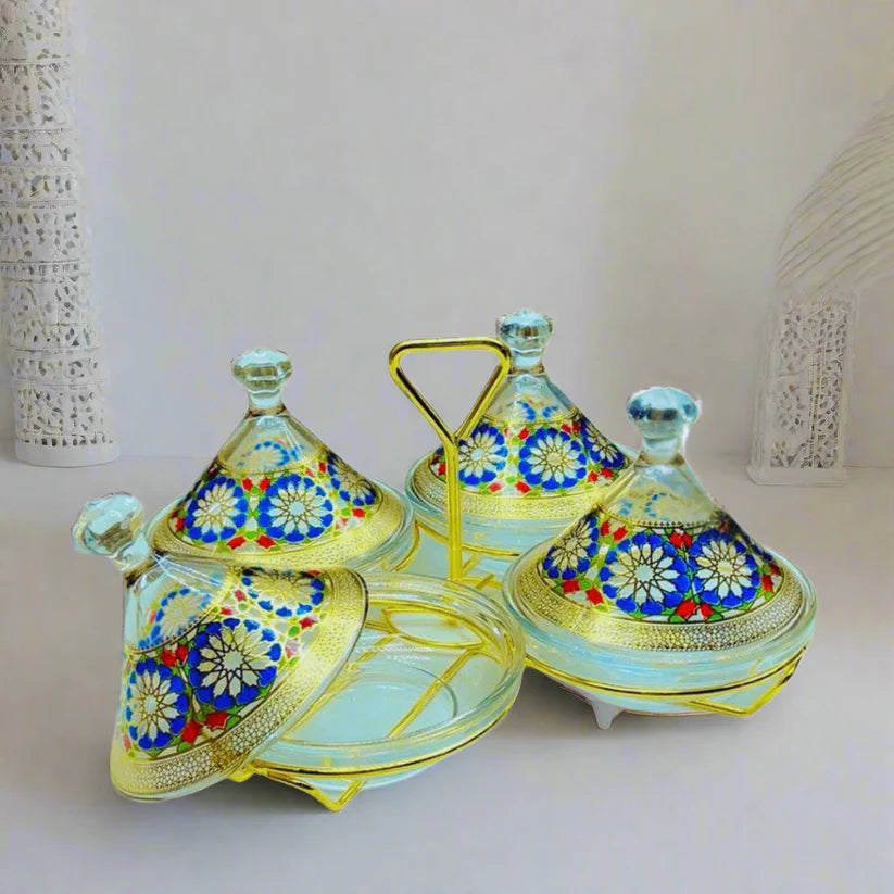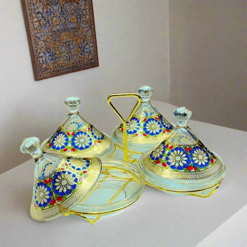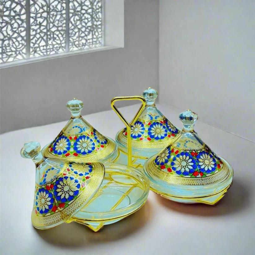 Apportez une touche d’élégance et de raffinement à votre table avec ce magnifique set de pots en verre style oriental 🌟. Chaque pot est décoré de motifs colorés traditionnels 🔴🔵🟢 et rehaussé de détails dorés luxueux ✨, parfaits pour conserver vos épices, condiments, fruits secs ou sucreries 🍬🌰.