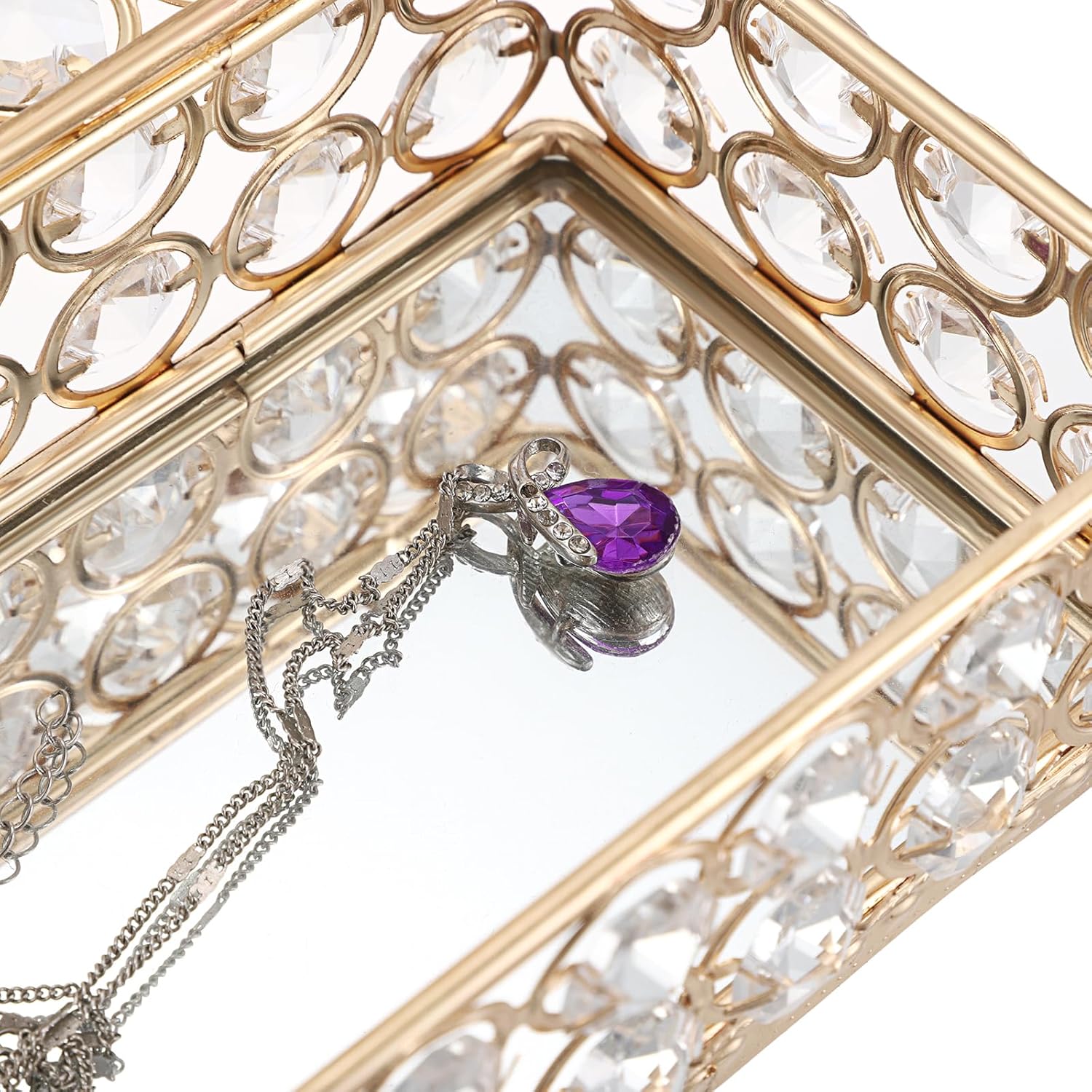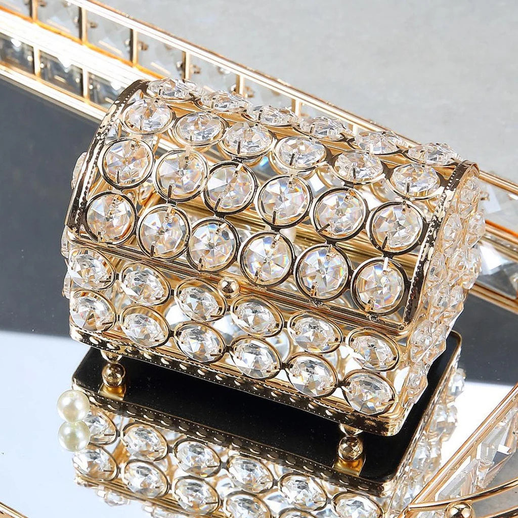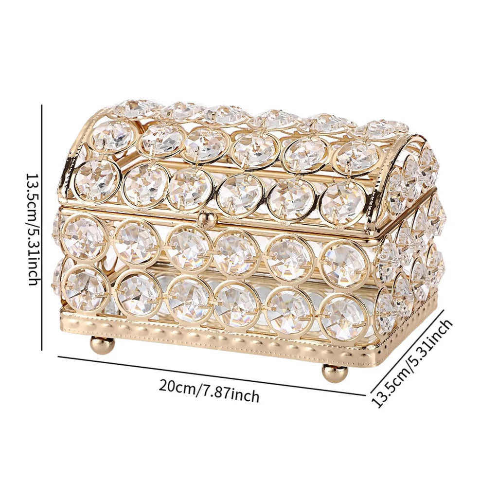 Chaque face de la boîte est ornée de gros cristaux transparents, soigneusement intégrés dans une structure métallique dorée de haute qualité, pour un rendu éclatant et prestigieux.