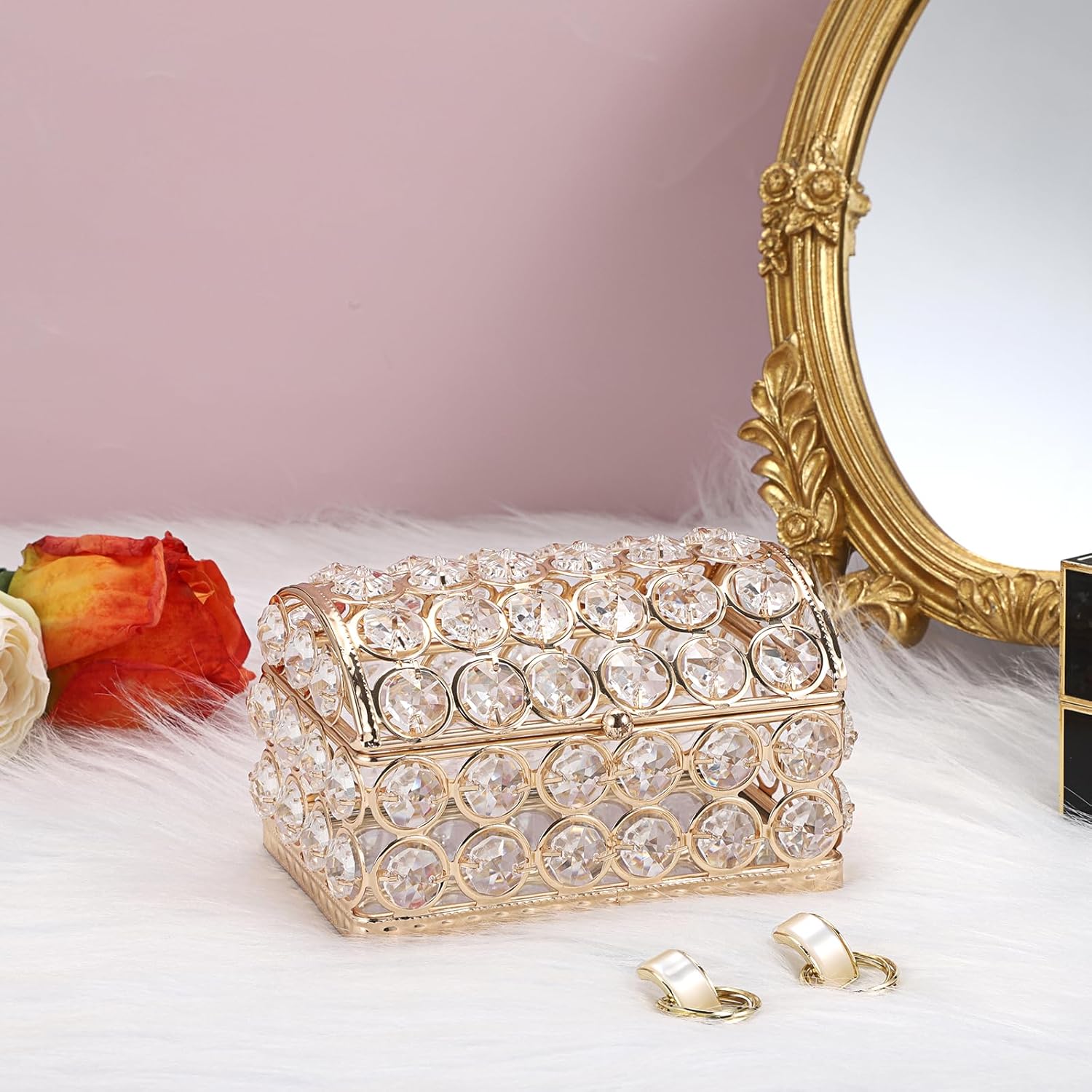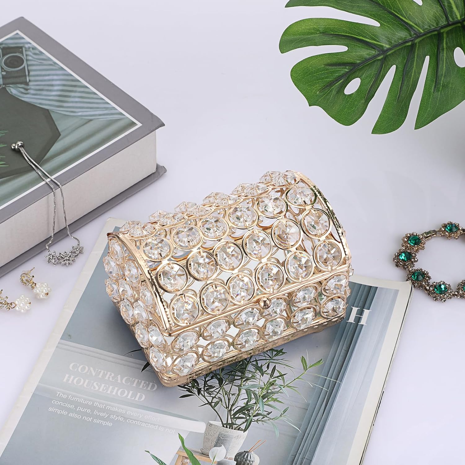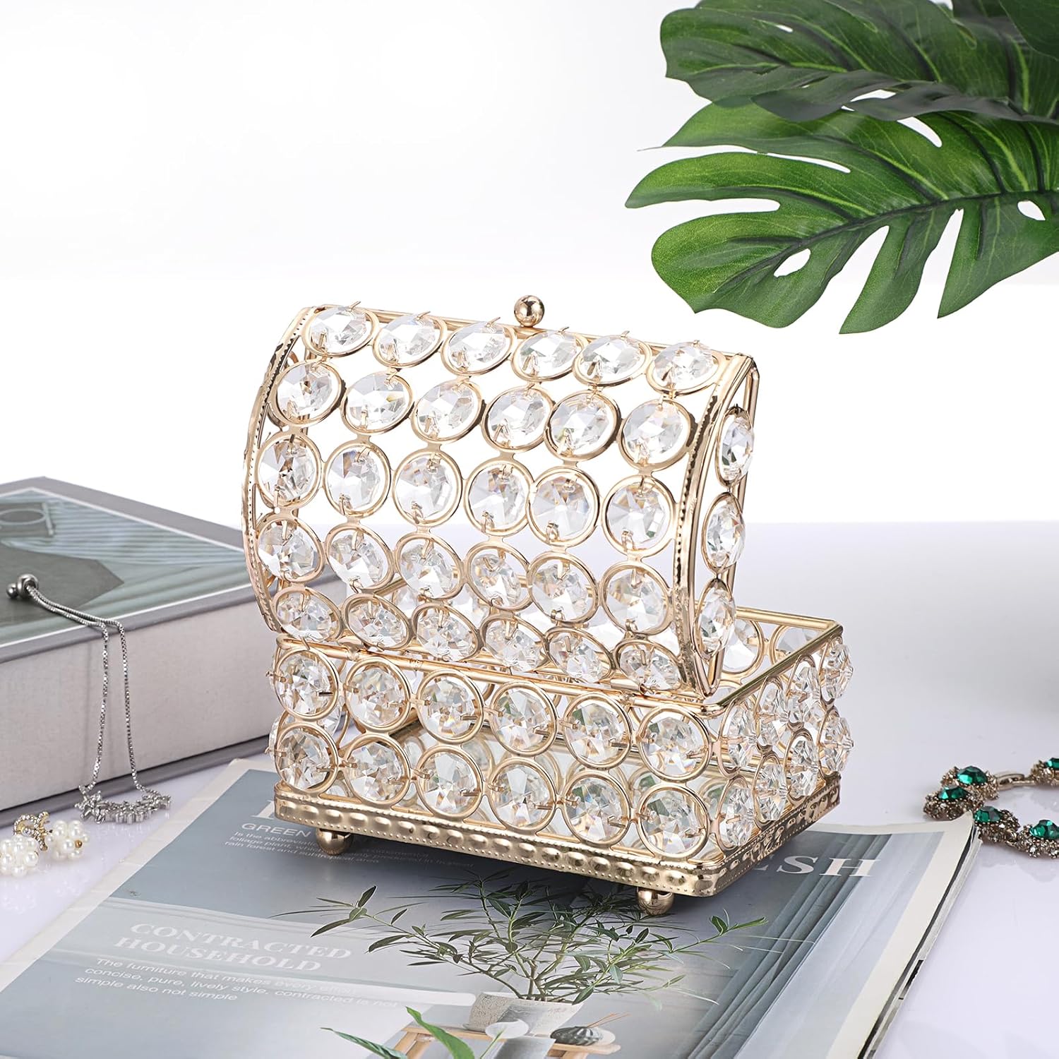 Chaque face de la boîte est ornée de gros cristaux transparents, soigneusement intégrés dans une structure métallique dorée de haute qualité, pour un rendu éclatant et prestigieux.