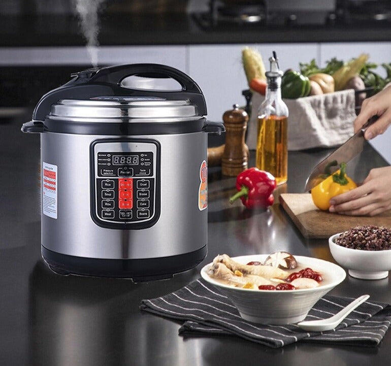 Fonction de décompression : lorsque la limite de pression à l’intérieur de l’autocuiseur échoue et que la pression dépasse la limite, l’autocuiseur dépressurise automatiquement autour du couvercle pour éviter une explosion.
