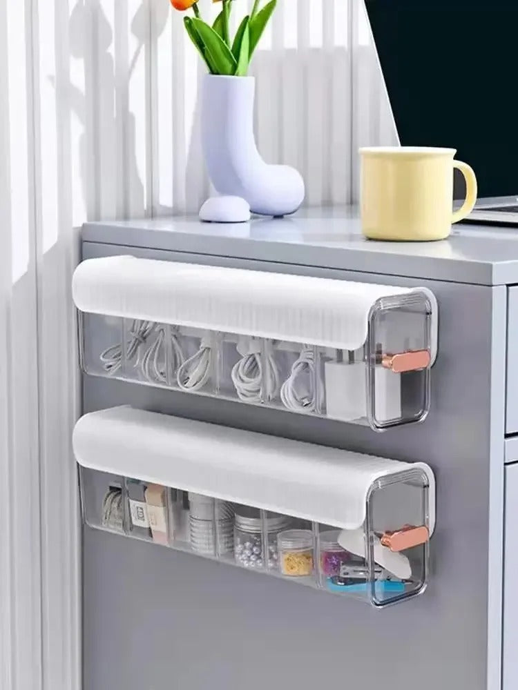 Équipée d'un séparateur mobile pour adapter la taille des compartiments selon vos besoins, comme pour des télécommandes ou des chargeurs de téléphone.