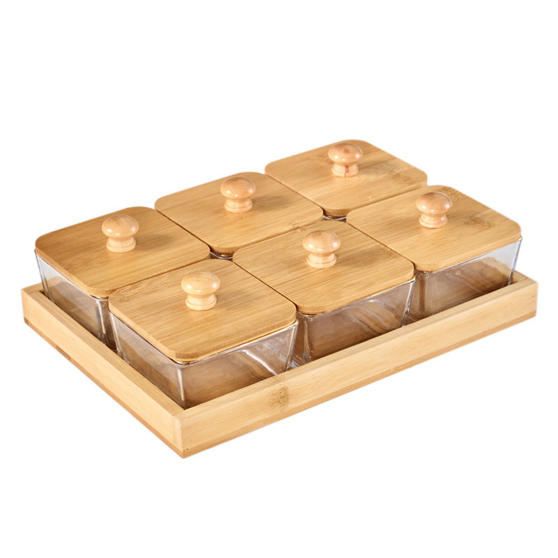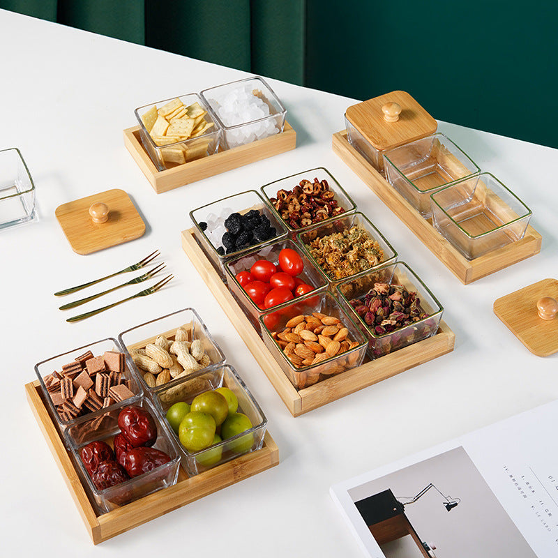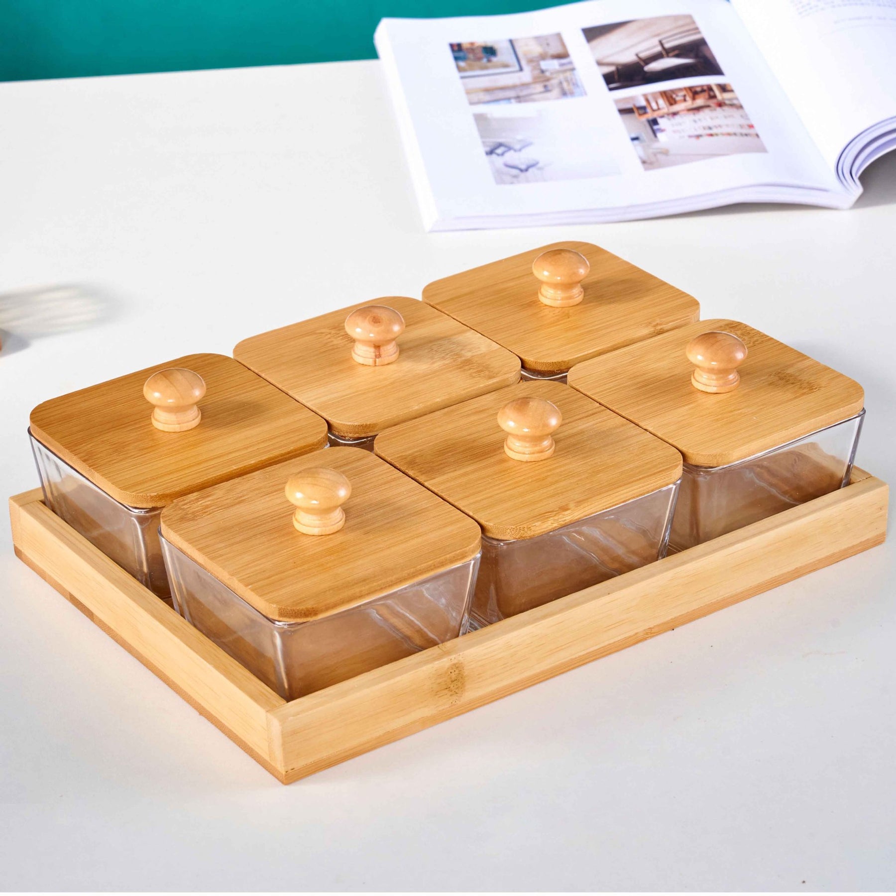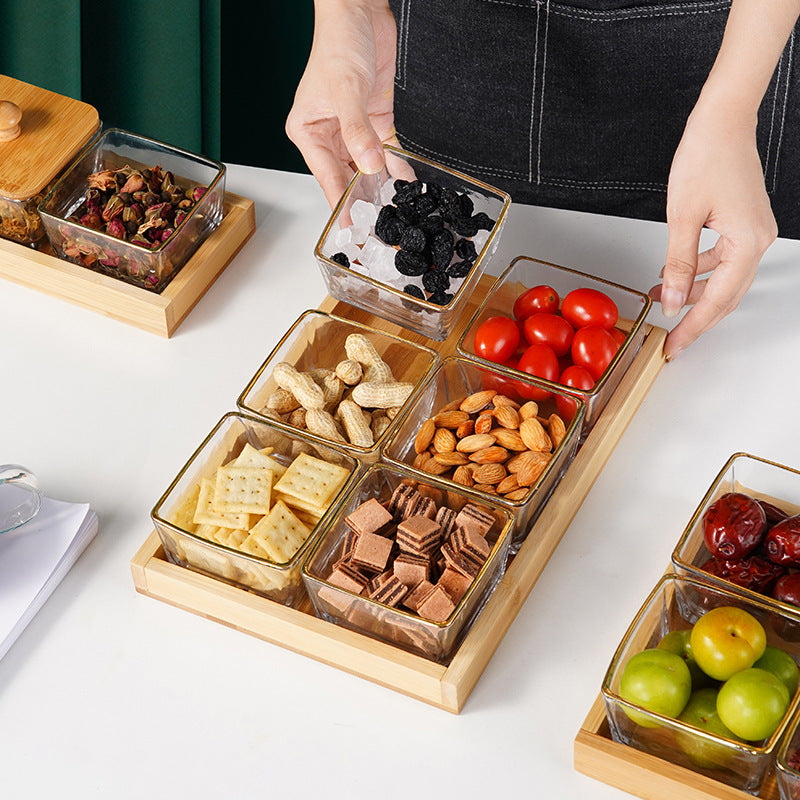 Offrez à vos réceptions l'élégance qu'elles méritent avec l'ensemble de service Kexon.ma. Cet ensemble 7 pièces (un plateau et six bols) est l'outil parfait pour un Gadwal ou un apéritif impeccablement organisé. Le mariage du bambou naturel et du verre cristallin apporte une touche moderne et épurée à votre table. Idéal pour présenter avec distinction vos fruits secs, olives, épices, ou petites gourmandises. Un must-have pour l'art de recevoir.