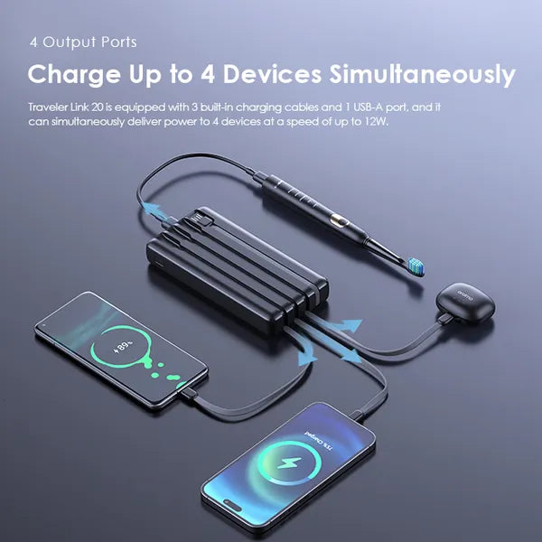 Traveler Link 20 est équipé de 3 câbles de charge intégrés et d'un port USB-A. Traveler Link 20 peut