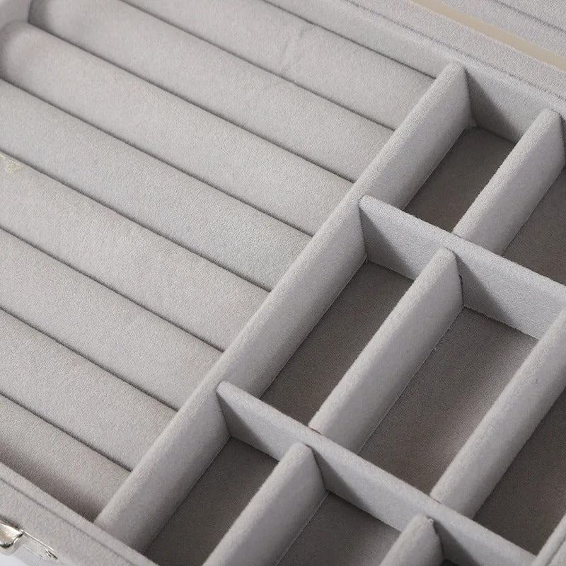 9 compartiments pour boucles d'oreilles, bracelets et petites broches ; 7 emplacements pour bagues et boucles d'oreilles.