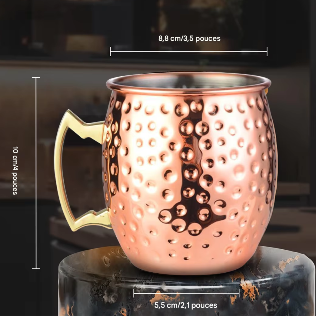 Savourez vos boissons froides avec élégance grâce à cette tasse Moscow Mule artisanale, fabriquée à 100 % en cuivre pur martelé, dans un style traditionnel qui allie authenticité et raffinement.
